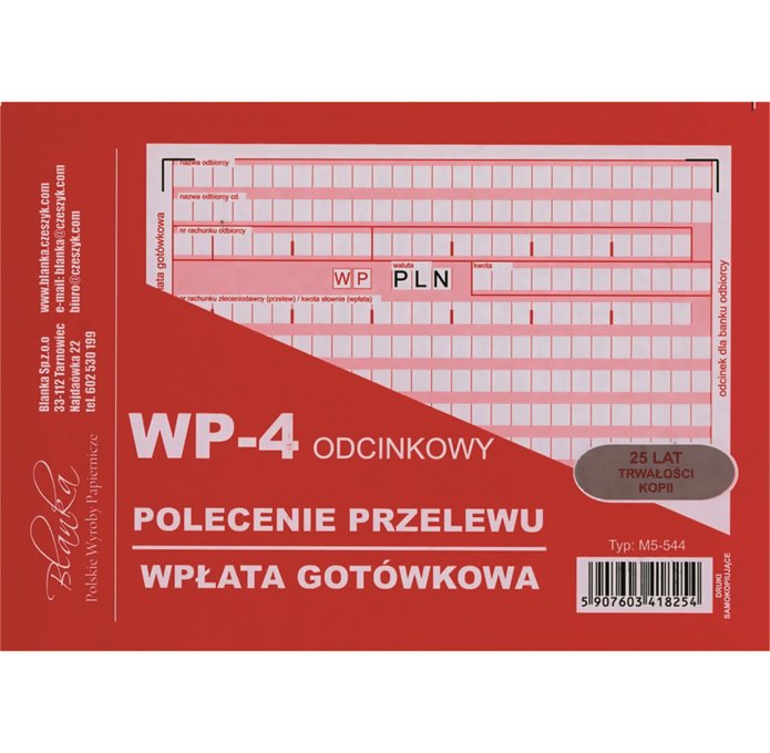 Opis produktuPolecenie przelewu/wpłatagotówkowa-4 odcinkoweOprawa: bloczek 80 kartekFormat: A6Zastosowanie: Druki kasowe, księgowe i bankowe