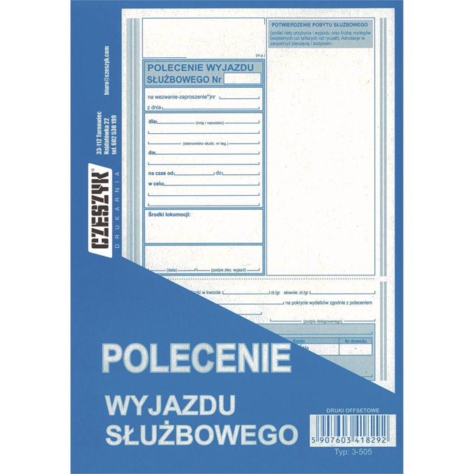 Opis produktuPolecenie Wyjazdu SłużbowegoOprawa: bloczek 40 kartekFormat: A5Zastosowanie: Druki samochodowe